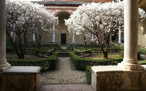 Devi suonare ad un campanello e inventarti una professione perché ti aprano: “scrittore” funziona sempre. “Sono uno scrittore, vorrei vedere il cortile”. Il portone si apre. Gli scrittori – tranne quando in crisi come quello di Shining – sono innocui sulla carne, incidono solo l’anima. Potresti trovare un giardino intero di alberi e piante che neanche nei giardini botanici. Potresti trovare il chiostro di una chiesa, con una specie rara di albero giapponese che fiorisce un giorno soltanto all’anno e quei quattro esemplari sembrano portare le nuvole a due metri da terra per una imminente teofania. Potresti trovare un giardino pieno di cose di altri mondi come in quello spazio a cui Ariosto si deve essere ispirato per la sua Luna d’oggetti smarriti. Potresti trovare una fontana di pietra circondata da un pergolato d’uva o semplicemente un albero di limoni come quelli di cui scrisse il poeta. Potresti trovare un eden intero dietro un portone di un palazzo e ti scroscerebbe dentro al petto, come gli orti dove Leonardo si riposava mentre inventava il Rinascimento dipingendo una Cena.