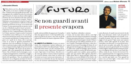 Sono sicura che FUTURO sia una delle maggiori parole da salvare, davvero. Tutti dicono che il futuro siamo noi ragazzi, tutti ci insegnano l’educazione, le buone maniere, come non perderci nelle metropoli e come pagare le bollette, il valore del denaro… Ma nessuno ci insegna davvero come e cosa scegliere. Quando, in FUTURO, ci troveremo dacanti a una scelta, come faremo se nessuno ci ha insegnato a valutare tutto, a riflettere…? La vita di oggi è tuttalpiù frenesia, non c’è più molta gente che si ferma a rifletytere molto… Ora: non so ancora di che cisa parli l’articolo, perchè io sono così. Prima scrivo che cosa mi dice il titolo e poi leggo, perchè se scrivo dopo finisce che mi faccio influenzare dalle idee altrui e non riesco più a trovare le mie. Questa è una cosa che ho imparato in questi 13 che sono al mondo…