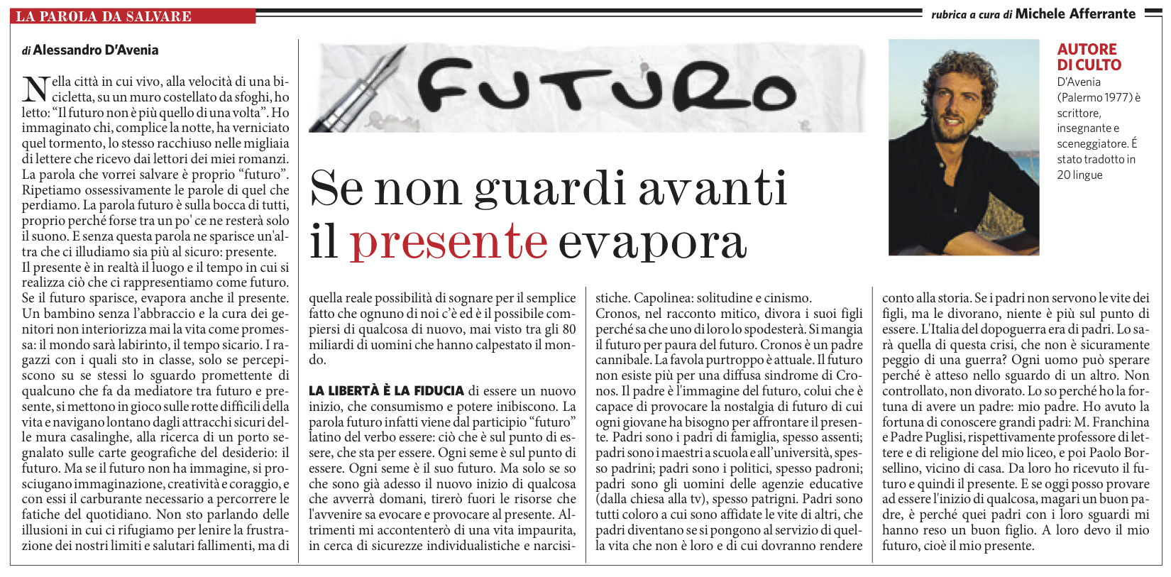 La parola che vorrei salvare è proprio “futuro”. Ripetiamo ossessivamente le parole di quel che perdiamo. La parola futuro è sulla bocca di tutti, proprio perché forse tra un po’ ce ne resterà solo il suono. E senza questa parola ne sparisce un’altra che ci illudiamo sia più al sicuro: presente.