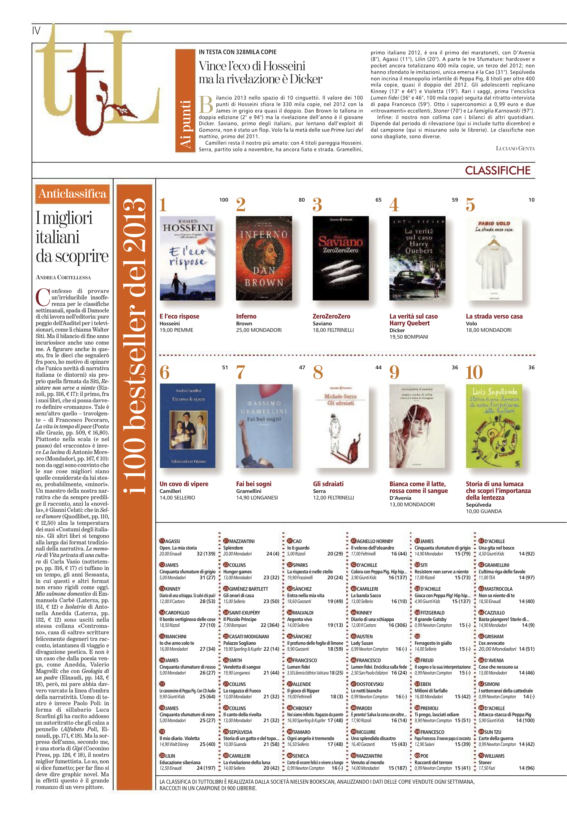 LaStampa_ttl_20140104_004L’inserto letterario della Stampa, Tuttolibri, ha pubblicato, nel primo numero di gennaio, i 100 best-seller del 2013: i cento libri più venduti (non so se all’azione del comprare corrisponda anche quella del leggere ed è il limite evidente di queste classifiche mercantili). Ma voglio condividere con voi la soddisfazione – dato che a voi la devo – di Bianca come il latte rossa come il sangue (uscito nel gennaio 2010) al 9° posto e Cose che nessuno sa (uscito nel novembre 2011) al 66°. Tutti gli altri libri in classifica sono usciti nel 2013 o al massimo nel 2012.