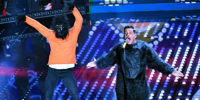 Fiorella con i suoi gesti rimanda alla canzone. Gabbani con i suoi gesti, colori, maschere, rimanda ad altro, a ciò che cerca, oppure no, a partire da un libro che già negli anni ’70 ci ricordava che non eravamo altro che scimmioni senza peli.