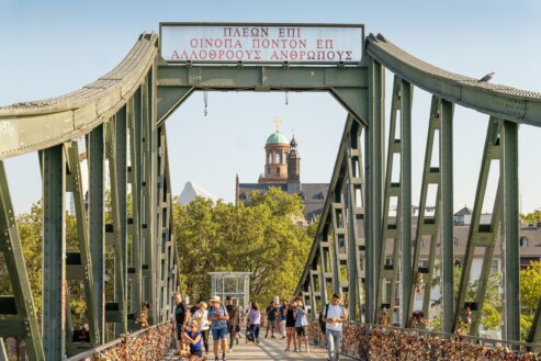 Più tardi, vagando per la città e pensando ancora a quella coppia, mi sono ritrovato sul famoso Eiserner Steg, il ponte di ferro che, con alterne vicende, collega dal 1868 il centro ai quartieri oltre il fiume Meno. Una gigantesca scritta in greco svettava sul ponte. Che ci faceva lì? Qualche anno fa un artista ha voluto che in cima fosse ben visibile un verso dell’Odissea: “Navigando sul mare colore del vino verso genti che parlano altre lingue”. Ho attraversato il ponte (Omero, in questo verso, chiama il mare con uno dei suoi nomi greci: pontos, termine che ne indica la capacità di fare proprio da “ponte” tra terre e tra uomini) e, vicino ai tanti stranieri che lo attraversavano, ho sentito che Omero aveva ragione: siamo tutti compagni di viaggio nello stesso mare della vita e con una meta comune: casa.