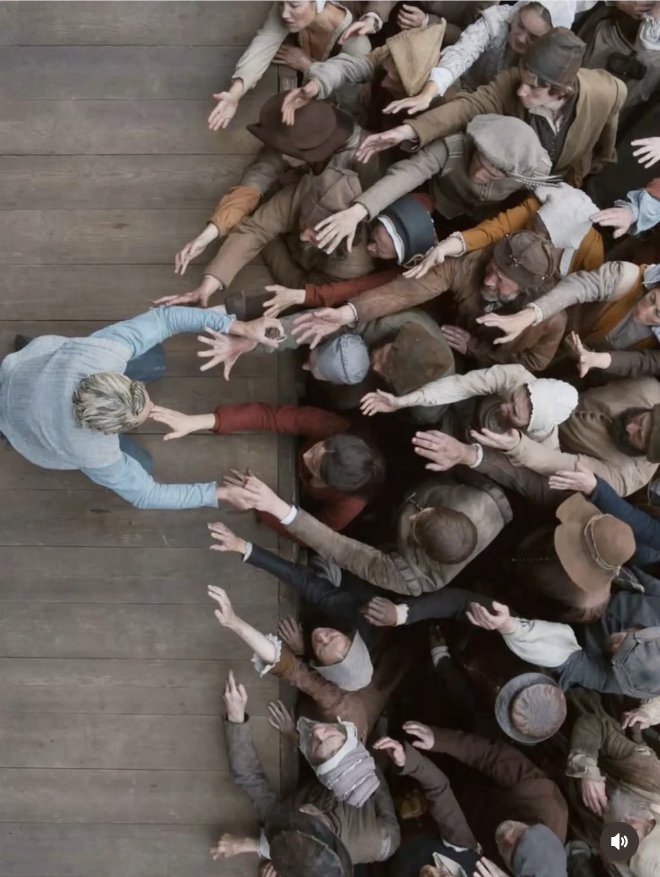 Chi pensa così ha fame perché gli manca realtà (senso e unità): la vita che hai è data, a te e a tutti. Solo chi conosce la fame conosce veramente l’uomo, perché sente, nella carne, che siamo compagni(da cum e panis: chi condivide il pane) di viaggio. Ecco il punto: il corpo ci porta allo spirito, e quando i due sono ben uniti ci sentiamo donati a noi stessi e legati realmente agli altri, sentiamo in ogni cosa la fatica della fragilità, e allunghiamo la mano verso l’altro perché non si senta solo, come la donna all’uomo morente sulla scena.